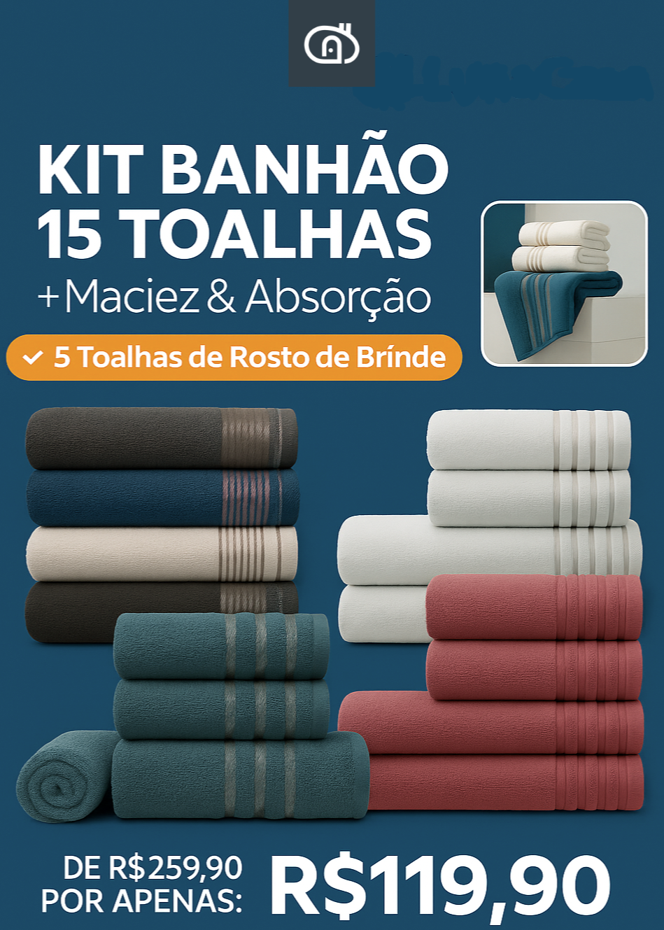 Transforme sua rotina de banho em um momento de puro relaxamento com o nosso Kit com 15 Toalhas Super Banhão de Alta Maciez e Absorção. Produzidas com fibras de alta qualidade, elas proporcionam toque suave, absorção rápida e durabilidade incrível.